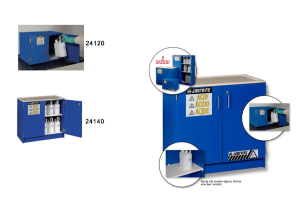 Justrite Ahşap Lamine Depolama Dolapları fenol, nitrik asit, sülfirik asit gibi yüksek derecede aşındırıcılara uygundur. Uzun dayanan ağaç gövdesi ve eşsiz güçlü paslanmaz çelik tutamaklar ve menteşeleri ile kuvvetli asitlerin ekileri ile başa çıkar. Raflar merkezden 32 mm ayarlanabilir ve bu şekilde pek çok kabın depolanmasına olanak sağlar.Dolaplar yükseltilebilir ayaklar, Haz-Alert™ patentli reflektif etiketler ve güvenlik için çift anahtar gibi aksesuarları ile gelir.