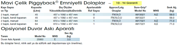 Justrite Piggyback® Dolaplar standart 114 ve 170 litrelik emniyetli dolaplar üzerine monte edilebilecek şekilde tasarlanmıştır. Tek başına veya ek depolama alanı olarak kullanılabilir. Piggypack dolaplar duvara asılarak ya da tezgâhüstü olarak da kullanılabilirler.
