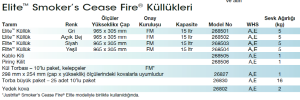 Elite™ Smoker’s Cease Fire® küllükler sigara izmaritlerini gayet şık bir şekilde biriktirerek yangın riskini de azaltır. Polietilen gövde yanmaya direnç sağlarken paslanmaz çelik ağızlık da külün tamamının içeri dökülerek ortamın temiz kalmasını sağlar. Hazne içinde çelik kova bulunur. Bu küllükler sökülebilir olduğundan sevkiyat ambalajları küçüktür. Opsiyon listesindeki kablo ile rüzgârlı havalara ya da hırsızlığa karşı emniyet sağlanabilir. Tek kullanımlık torbalarla da hazne içindeki kovanın temizliği kolayca yapılabilir.