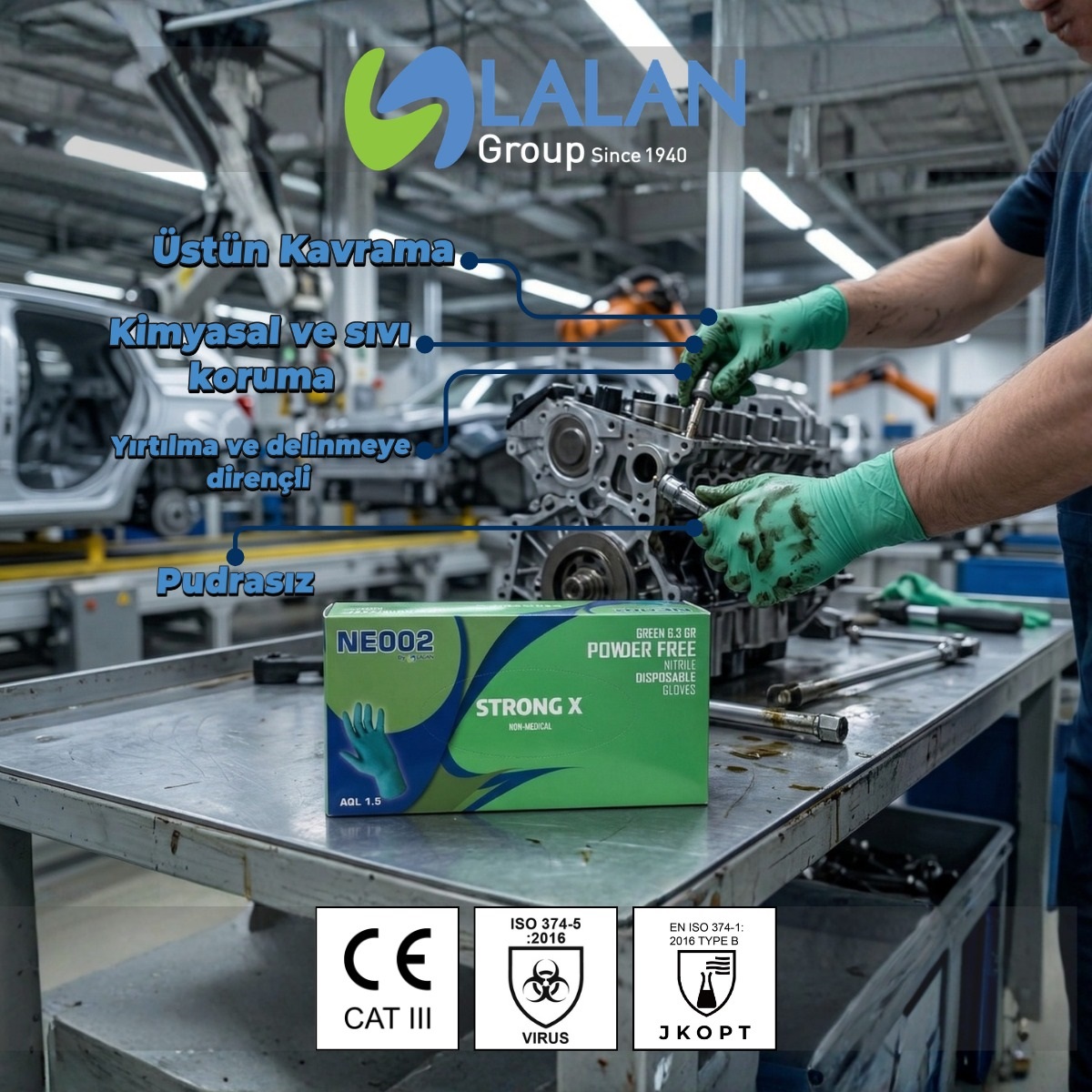 İş güvenliği ve hijyenin ön planda olduğu profesyonel alanlar için özel olarak tasarlanan Lalan STRONG X Yeşil Pudrasız Nitril Eldiven, elleriniz için maksimum koruma ve konforu bir araya getiriyor. %100 nitril malzemeden üretilen bu dayanıklı iş eldiveni; kimyasal maddelere, zorlu sıvılara ve fiziksel aşınmalara karşı kalkan görevi görür.