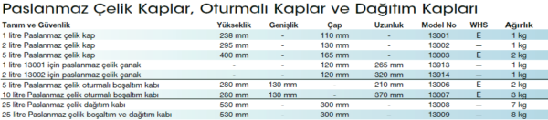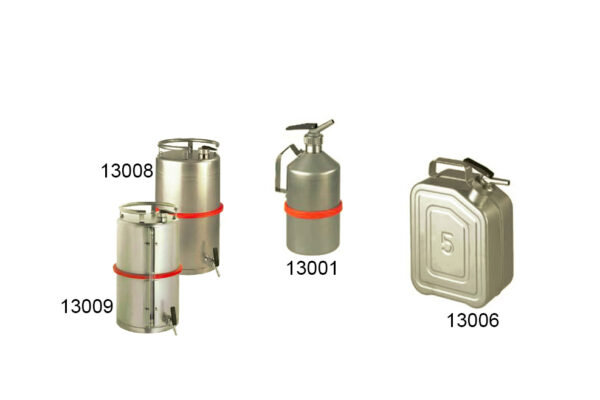 Justrite Paslanmaz Çelik Kaplar ve Dağıtım Kapları yüksek derecede saflık gerektiren yanıcı sıvıların güvenli ve eksiksiz aktarımı içindir. Cilasız 1,4571 paslanmaz çeliktir. Contası teflondur. Dağıtım kabının koruma contası plastiktendir. Tüm kap modellerinde: