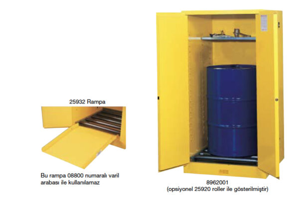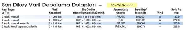 Dikey Varil Depolama Dolapları bir veya iki 110dan 200 litreye kadar varili depolayabilir. Tüm dolaplar sökülebilir ayarlanabilir yarı derinlikte raflara sahiptir ve bu şekilde 3. sınıf kimyasalları ve varil hunileri, menfez ve antistatik kablo gibi yedek parçaları depolayabilirsiniz. Dolaplar pompa veya ağızlığı olan varillere uygun tasarlanmıştır ve bu yüzden pompa istasyonu veya atık biriktirme istasyonu olarak da kullanılabilir. Dolaplar yürüteç aksesuarları ile de olmadan da kullanılır. Kullanılırsa ağır varilleri taşımak kolay olur.