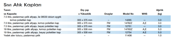 Justrite Atık Sıvı Kapları yüksek yoğunlukta polietilen yapısı ile mükemmel kimyasal dayanıklılık ve sızıntı korunması sağlar. Geniş ve uygun bir şekilde yerleştirilmiş açıklığı ile kontrollü dolum boşaltım yapılmasını sağlar. Kolay taşımaya uygun tutamaktaki sabit poziyonlu mandal uygun boşaltım için kap ağzını açık tutar. Kapatıldığında kapak 0,2 ve0,35 bar arasında otomatik havalandırma sağlar. Alev kesici geri teperek tutuşmalara karşı güvenlidir. Çelik kaplı donanım ekonomik bir çözümdür. Paslanmaz çelik donanım aşındırıcılara karşı en uygun korumayı sağlar. 14724 nolu model polietilen dolum aygıtına uygundur. Göstergesi kabın neredeyse dolduğunu göstererek uyarır.