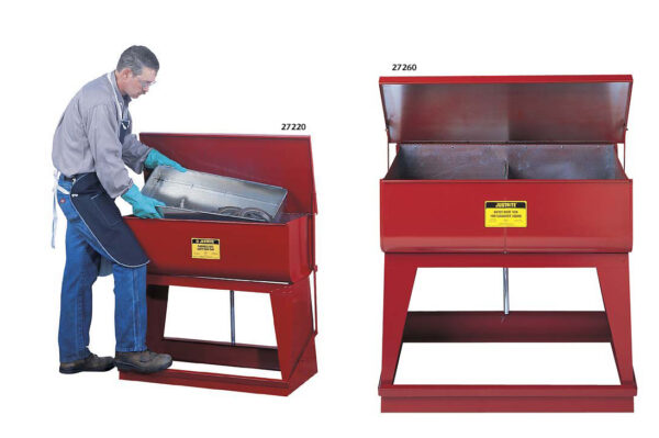 Justrite Temizleme Tezgâhı üzerindeki ayaktan pedalla açılan kapak sistemiyle çalışanın iki elinin de boşa çıkması sağlanmakla birlikte basılmadığında kendiliğinden kapanan özelliktedir. Bir pnömatik silindir yardımıyla pedal bırakıldığında kapağın yavaşça kapanması sağlanır. 1.9 cm (¾”) çapındaki drenaj, kirli solventin kolayca boşalmasına yardımcı