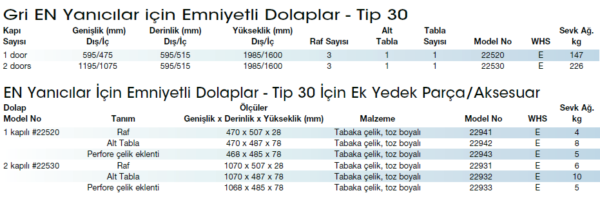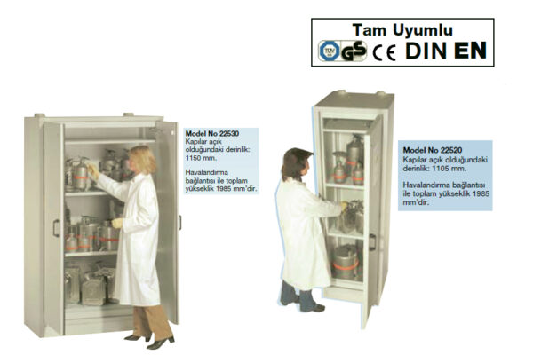 Yangının verebileceği zarardan korunurken, Tip 30 Emniyetli Dolaplardan faydalanmak yanıcı sıvıları depolamak ve saklamak için en ekonomik yoldur. Çalışma alanlarında Tehlikeli maddeleri depolarken TRbF 20 Ek L ye uygun kanatlı kapılar kullanılmıştır.