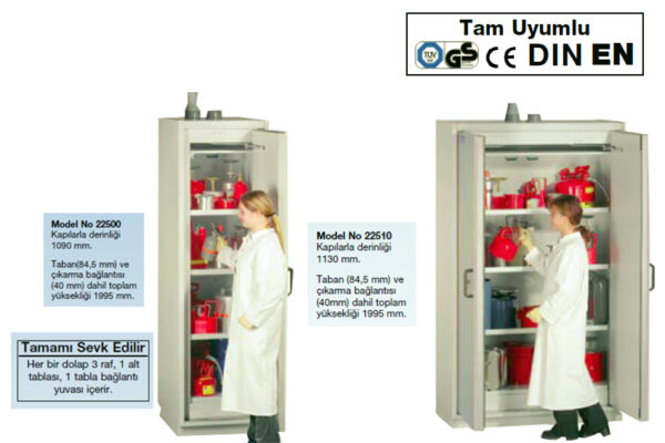 Tam teşekküllü emniyetli dolaplar yanıcıların güvenli ve uygun depolanmasını sağlar. Çalışanların yaralanmasını en aza indirgerken yangın riskini azaltır, uygun yerleştirildiğinde verimliliği artırır. Çalışma ortamında tehlikeli maddelerin depolanabilmesi için TRbF 20 ek Lye uygun kanat kapılara sahiptir.