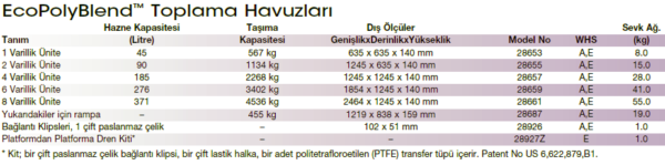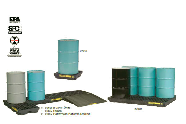 Düşük Profilli EcoPolyBlend™ Toplama Platformları Varillerin kolay yüklenmesi için sadece 140 mm yüksekliğindedir. Bu platformlar batarya, çeşitli kimyasalların bulundurulması ve/veya varil doldurma/ boşaltma esnasındaki döküntülerin muhafazası için idealdir. %100 geri dönüşümlü polietilen tek parça olarak üretilmiş hazne kısmı sızıntı yapmaz ve aynı zamanda asit ve kimi aşındırıcı sıvılar dahil kimyasallara dayanıklıdır. Sağlam, kolay yerleşen ızgaralar üst üste binmez, temizleme esnasında kolaylıkla kaldırılabilir. Platform Rampası platform üzerine varillerin çıkarılması veya indirilmesini tırtırlı yapısı sayesinde maksimum emniyetle gerçekleştirmek için yapılmıştır. 2,4,6 ve 8 varillik platformlar istendiği şekilde birleştirilerek işletme gereksinimlerine uygun hale getirilir ve rampalarla birleştirilebilir. Bu platformlar bağlantı klipsleri ile birleştirilerek kesintisiz hale getirilebilir. Klipsler gereksinime göre çıkarılarak platformlar farklı şekilde yerleştirilebilir. Kesintisiz bir hazne oluşturmak için platformdan platforma dren kiti (bağlantı klipsleri ve bağlantı tübü içerir) kullanılabilir. Böylece 270 litreye varan hacimlerde ve yönetmeliklere uygun hazne sistemi oluşturulabilir.