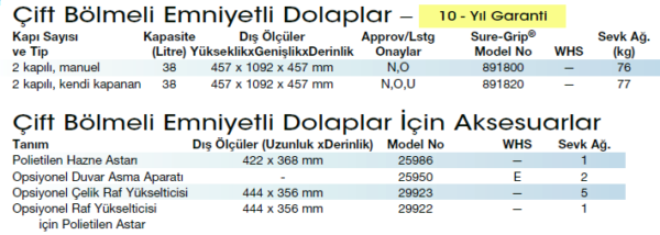 Çift Bölmeli Emniyetli Dolaplar 38 mm hava aralığı olan çift duvar bölmesi ile 19 litrelik alanlar yaratarak içeriğin ayrılmasını sağlar. Her bir bölüm kapıları bağımsız kapanır. Büyük içerik etiketleri tanımlama yapmayı kolaylaştırır. Aşındırıcı bölümdeki çıkarılabilir karter zorlu kimyasallara dayanması için çift astarlanmıştır. Sırtlık dolap boyu vardır.